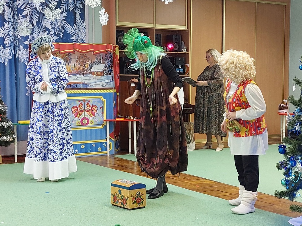 С самого начала представления ведущий праздника – учитель-логопед Антонова Вера Викторовна и сказочные герои: Кикимора – воспитатель Борщовецкая Екатерина Владимировна и Домовенок – воспитатель Цацко Людмила Викторовна пригласили детей в сказочную страну Метелицы, роль которой исполнила учитель-логопед Наталья Юрьевна Сыровежко. Волшебный мир сказки помог всем окунуться в праздничную атмосферу Рождественских приключений.