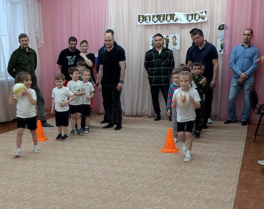 Были приглашены папы, дедушки и старшие братья воспитанников. Дети, педагоги и родители ответственно отнеслись к данному мероприятию, дети выразительно читали стихотворения, пели песни, конечно же и взрослые совместно с детьми отгадывали загадки, показали свою силу и выносливость - отжимались от пола и участвовали в спортивных эстафетах.