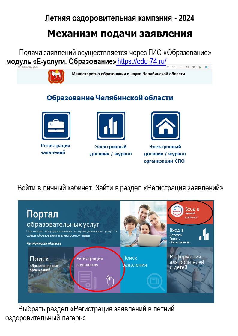 Подача заявлений осуществляется через ГИС «Образование» модуль «Е-услуги. Образование» https://edu-74.ru/