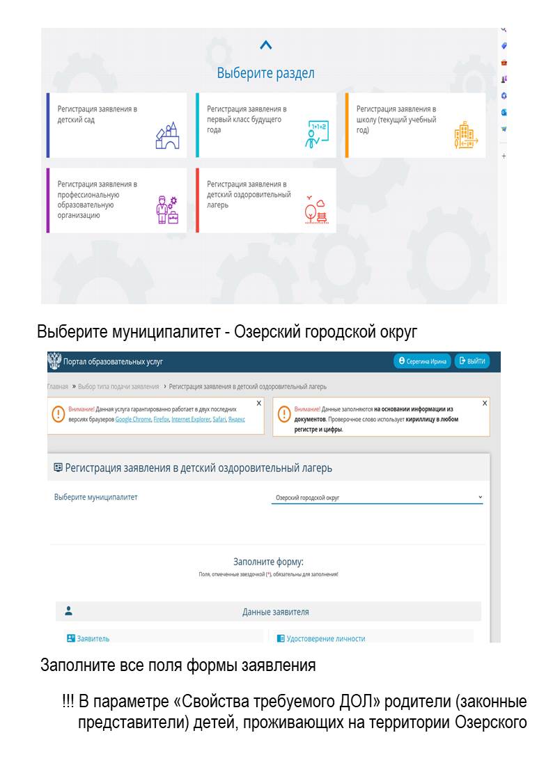 Необходимо зайти в раздел «Регистрация заявлений»/ «Регистрация заявлений в летний оздоровительный лагерь»/ Озерский городской округ