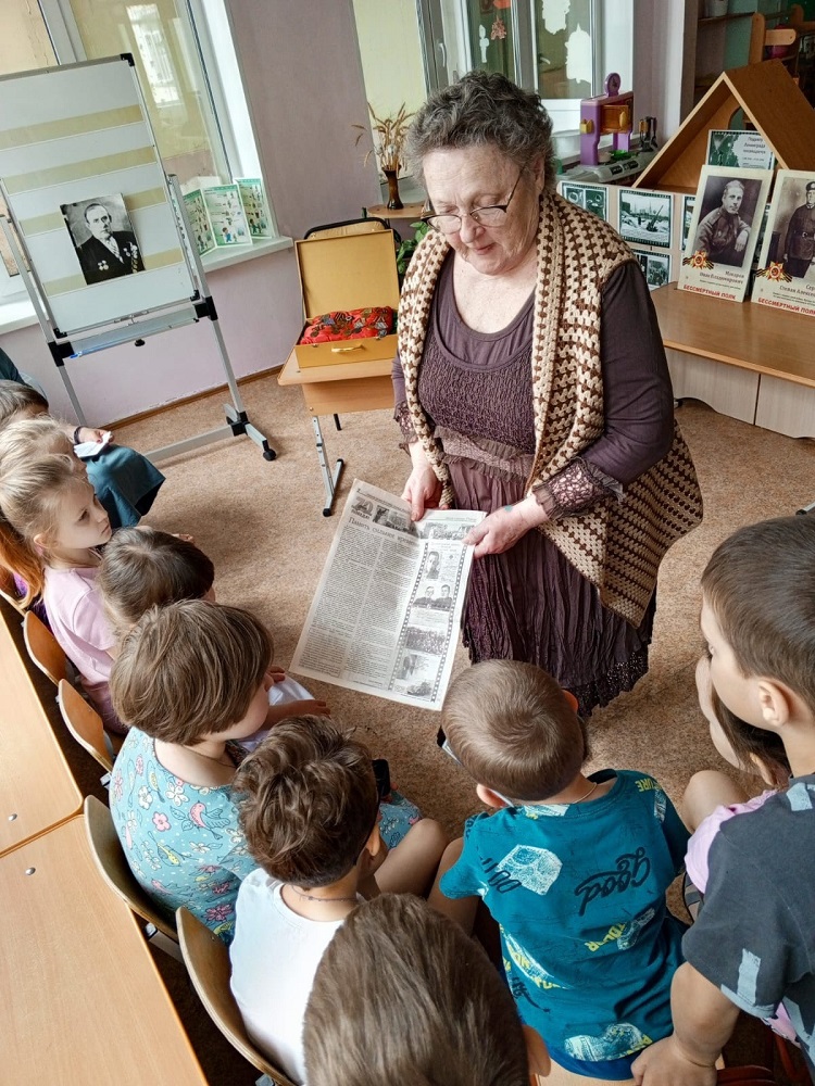 Интересным мероприятием стал приход в группу гостей: Макаровой Татьяны Александровны и Шумихина Клима, ученика 9 класса школы №32 (бабушки и двоюродного брата нашей воспитанницы) Татьяна Александровна со слезами на глазах рассказала детям о своём отце, Иванове Александре Ивановиче, который с самого начала войны попал на Ленинградский фронт, был водителем автомашины ГАЗ-АА и по "Дороге жизни" возил в блокадный Ленинград продукты, а оттуда вывозил людей. Прадедушка Кати прошёл всю войну и до её окончания служил в составе 4-ой Украинской армии, за что и был награждён боевыми орденами и медалями.