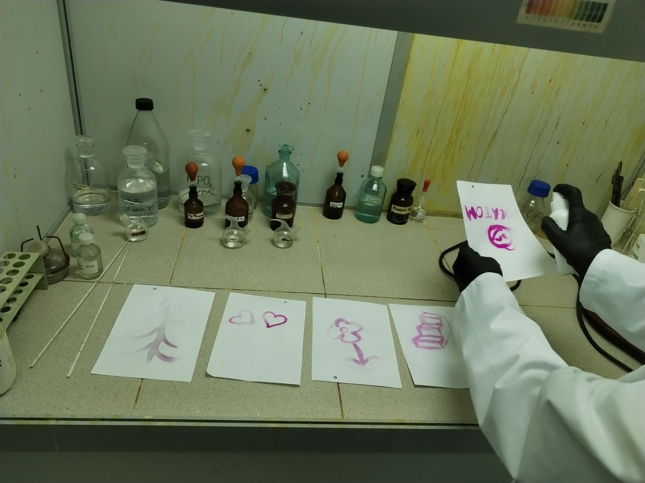 Еще был сухой дым и эксперимент с пигментом цветной капусты. Когда прозрачные рисунки проявляются в цвете фиалки.