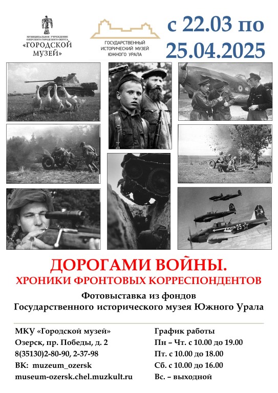 С 22 марта 2025 г. в Озерском городском музее будет проходить выставка исторической фотографии «Дорогами войны. Хроники фронтовых корреспондентов». На ней представлены редкие документальные фото, иллюстрирующие, пожалуй, самую непростую эпоху в истории нашей Родины – Великую Отечественную войну. Создатели выставки постарались отобрать снимки, не слишком часто тиражирующиеся в тематических публикациях, но при этом фиксирующие важные детали событий. Некоторые фотографии делались налету, в сложнейших условиях боя. Некоторые снимались «по горячим следам», которые иногда именуют «постановочными». Разве можно считать постановкой фото солдат, только что вернувшихся из боя и даже не смывших с лица копоть боя, партизан, всего лишь вновь, после недолгого отдыха взваливших на плечи тяжёлую ношу по просьбе фотокорреспондента? Все эти люди живые свидетели той войны, и не всем, к сожалению, удастся её пережить. Но на фото они ещё молодые и полные надежд на победу. И на то, что они, рано или поздно, вернутся домой, к своим семьям и друзьям. Поэтому особое место на выставке занимают фото первых послевоенных дней, на которых усталые, но счастливые победители возвращаются к себе, к своей мирной жизни.