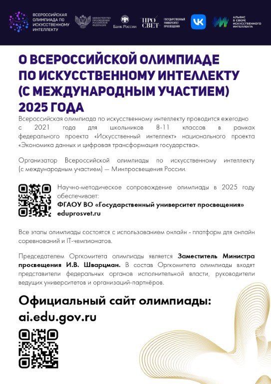 Всероссийская олимпиада по искусственному интеллекту проводится ежегодно с 2021 года для школьников 8-11 классов в рамках федерального проекта "Искусственный интеллект" национального проекта "Экономика данных и цифровая трансформация государства".
