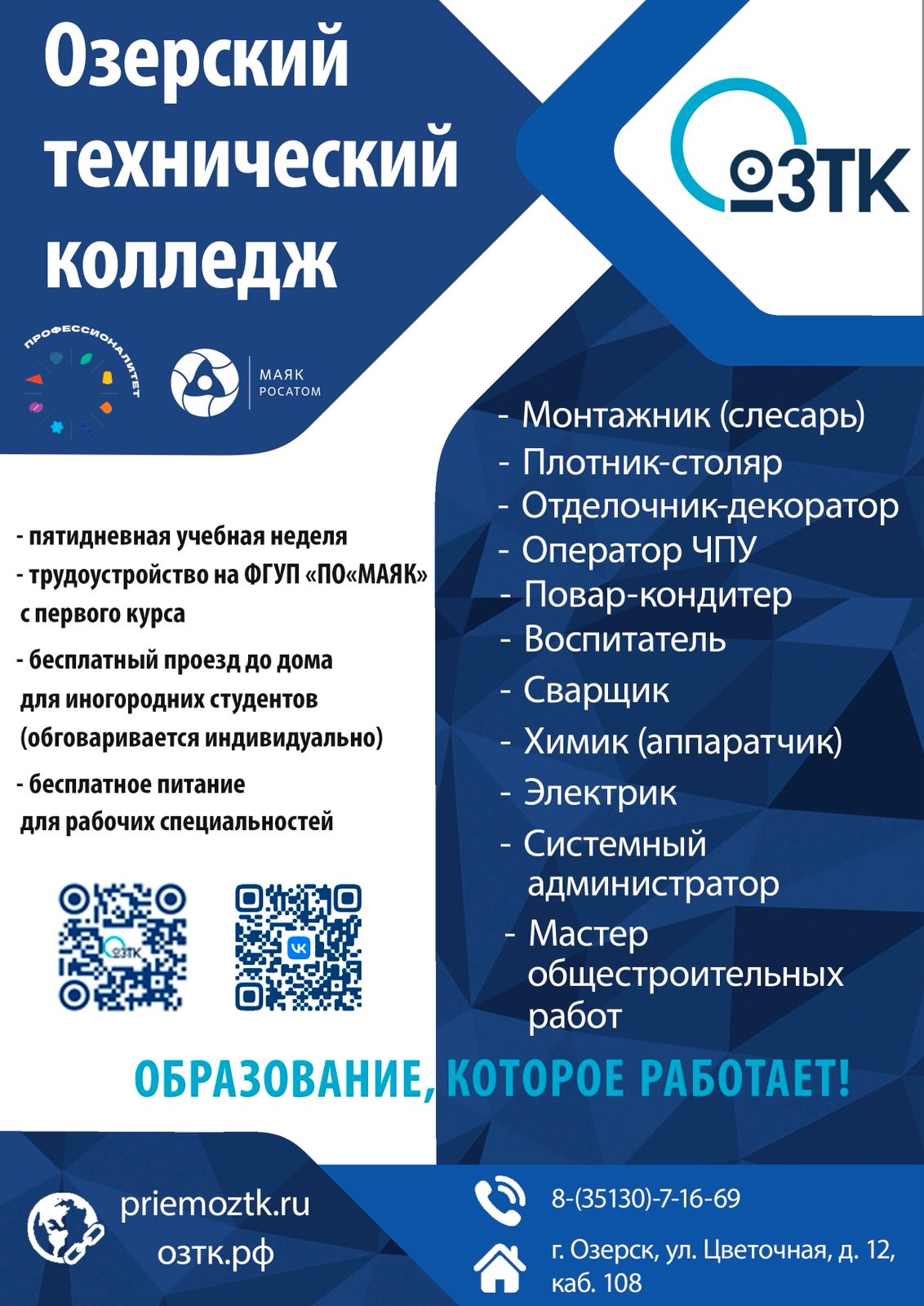 Озерский технический колледж в 2025 году ведет набор на 11 специальностям и профессиям, 7 из них входят в ФП «Профессионалитет».