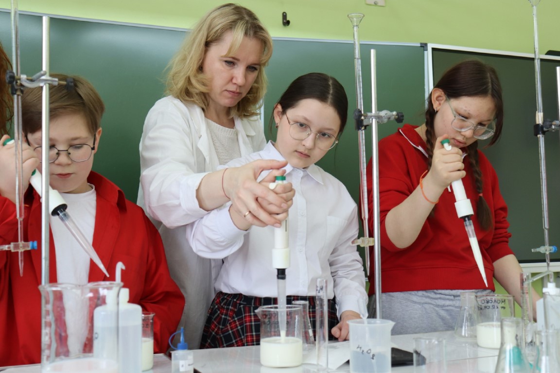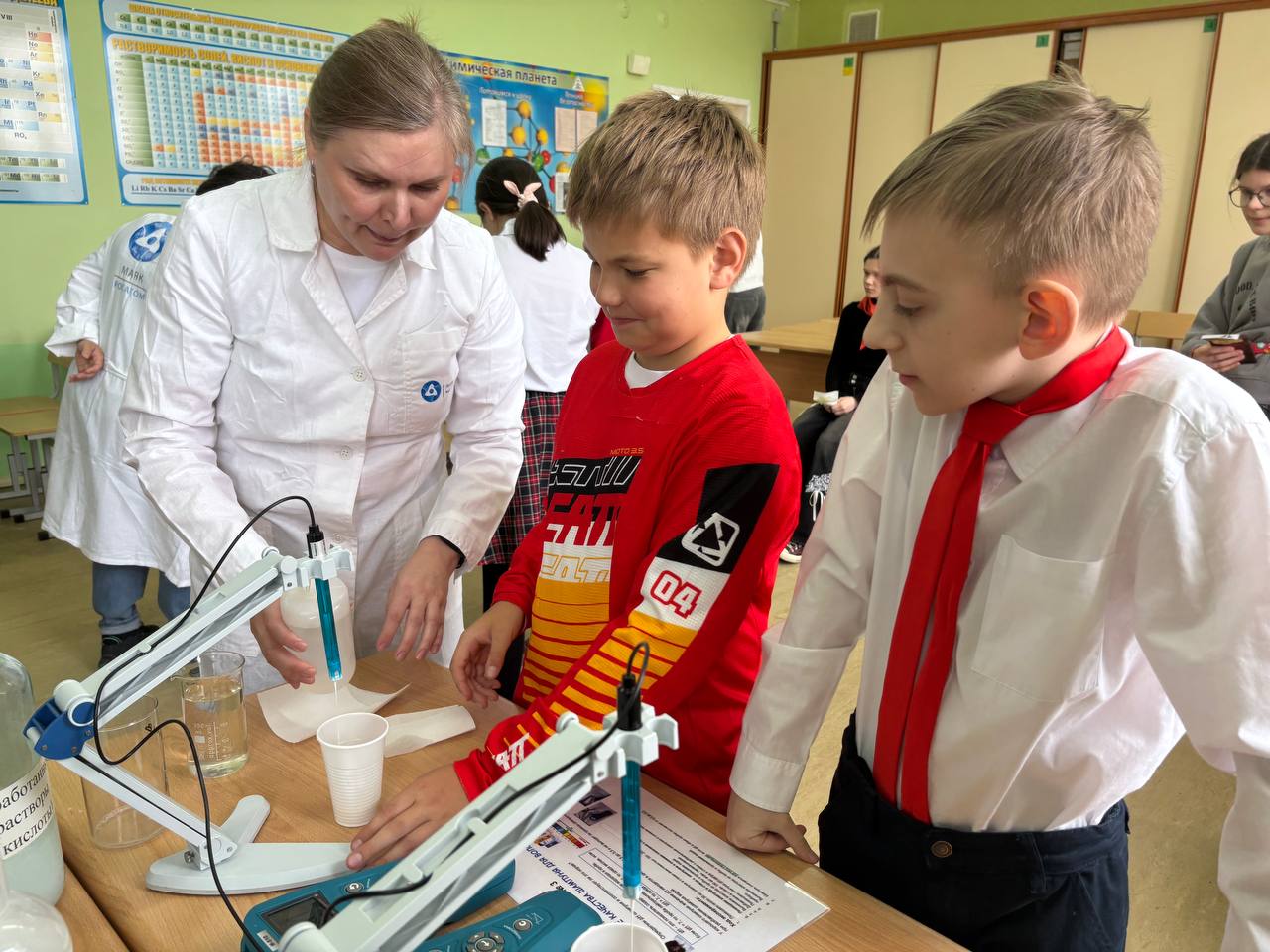 А сегодня мы решили заглянуть в гости к самым юным ученикам, к пятиклассникам. На «Дне проектов» специалисты ЦЗЛ – Ольга Степанова, Татьяна Зайцева, Ольга Диченко и Анна Брайчун – превратили обычный класс в настоящую лабораторию. Вместе мы проверяли качество шоколада, кислотность молока и безопасность шампуня.