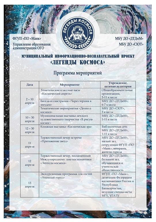 Весной текущего года в число победителей конкурса социально значимых проектов, организатором которого является ФГУП «ПО «Маяк», вошел информационно-познавательный проект «Легенды космоса», представленный в номинации «Образование» МБУ ДО «ДТДиМ».