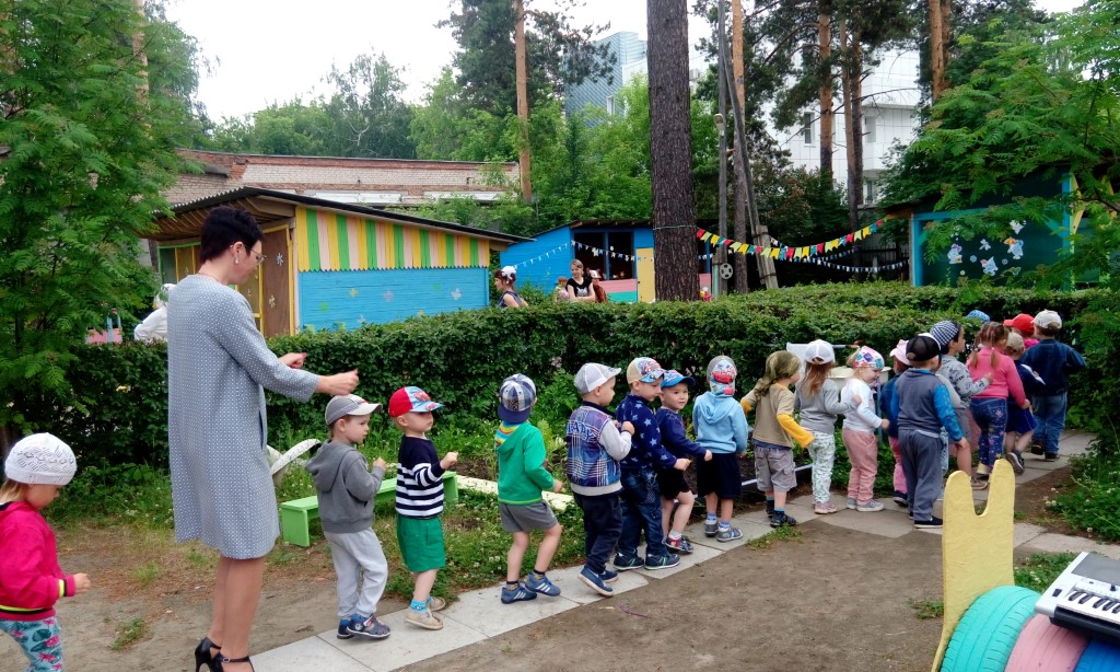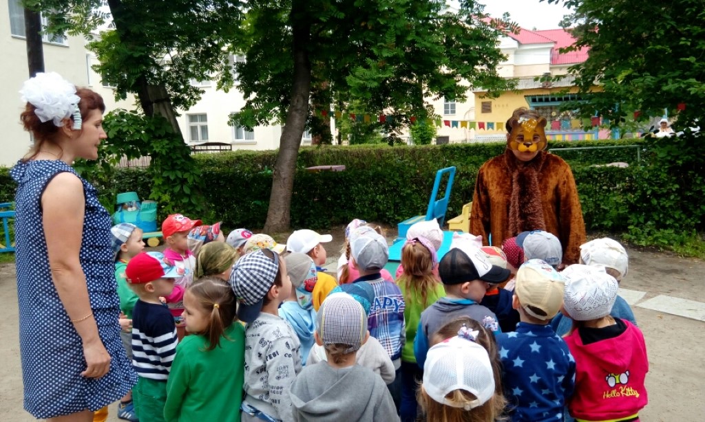 На первой станции ребят встретила Игринка Веселинка, которая принесла с собой сказочный билет на поезд. Малыши с интересом отправились в поездку. На первой станции «Песенная» (участок группы №5) их встретил Мишка с загадками и песнями.
