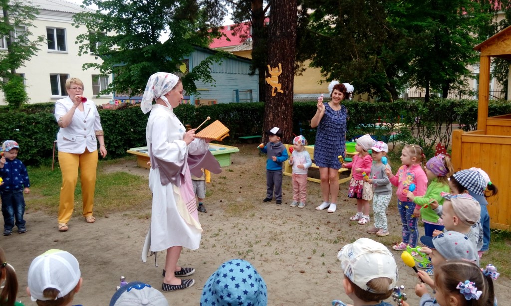 В конце путешествия станция "Музыкальная" (на участке №1), а там была Сорока-белобока. Она предложила ребятам организовать оркестр и вместе с ней сыграть русскую народную песню «Пчёлочка златая». Сорока играла на ксилофоне, а дети подыгрывали на погремушках, колокольчиках.