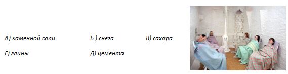 На иллюстрациях показаны комнаты, в которых проходят курс терапии люди с определёнными заболеваниями дыхательных путей. Нередко такие комнаты вырубаются непосредственно в месте залежей соответствующей породы. Из какого материала сделаны комнаты?