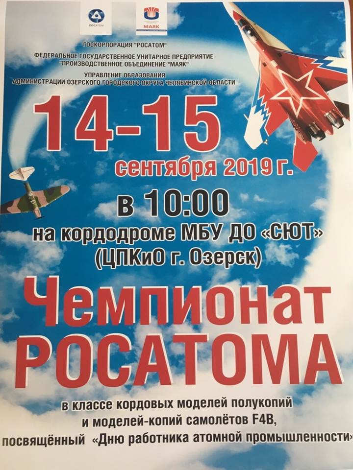 C 13 по 15 сентября 2019 года в Озёрском городском округе на кордодроме «СЮТ» (ЦПКиО) пройдёт Чемпионат по авиамодельному спорту, посвящённый «Дню работника атомной промышленности», среди обучающихся городов, расположенных на территории присутствия предприятий госкорпорации «РОСАТОМ». Озерскую команду возглавят опытные педагоги Станции юных техников Виктор Львович и Марина Алексеевна Думенек.