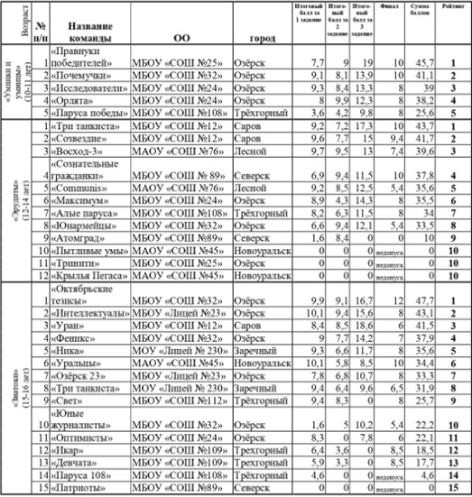 Озерский городской округ представили 13 команд из ОО №№ 23,24,25,32. Обучающиеся с 5 по 11 класс были поделены на возрастные категории «Умники и умницы» (10-11лет), «Эрудиты» (12-14 лет), «Знатоки» (15-16 лет). Участники турнира в течение 3 недель выполняли задания различного характера в социальной сети ВК.