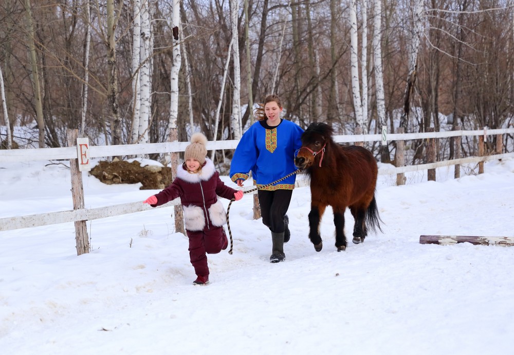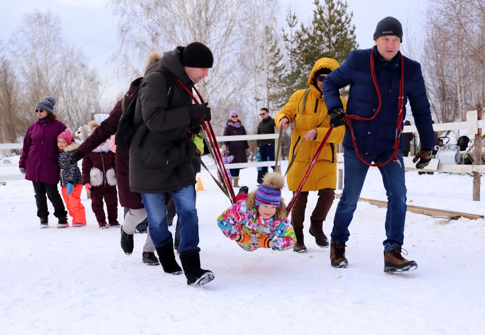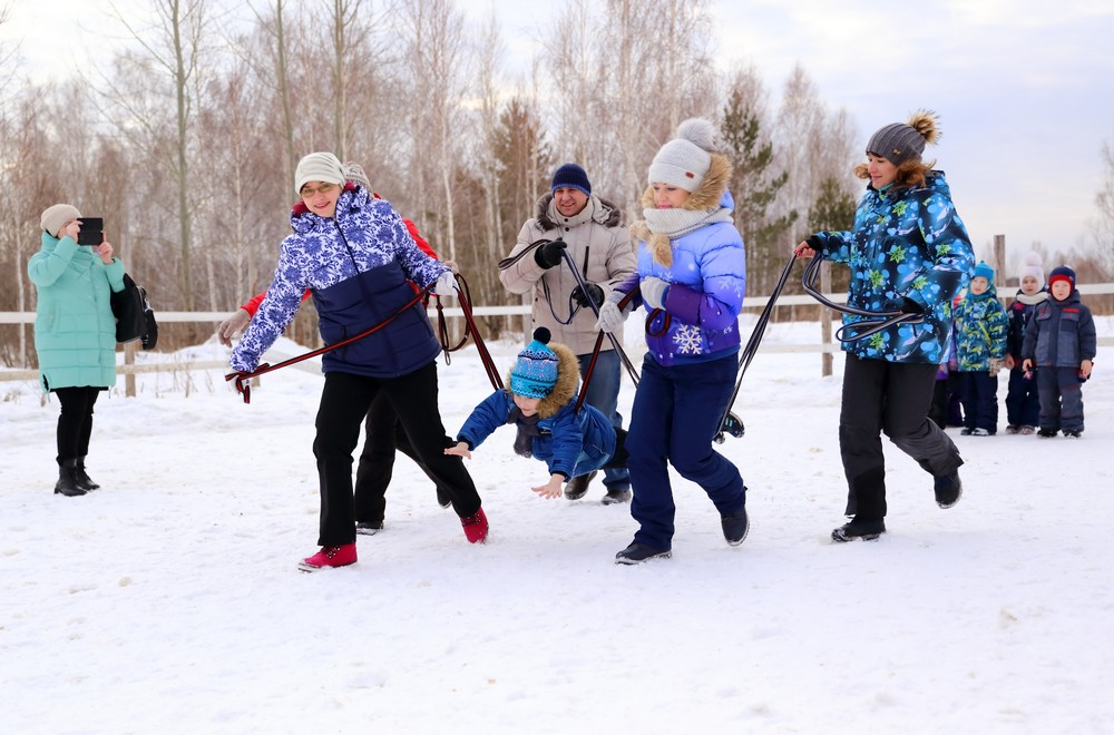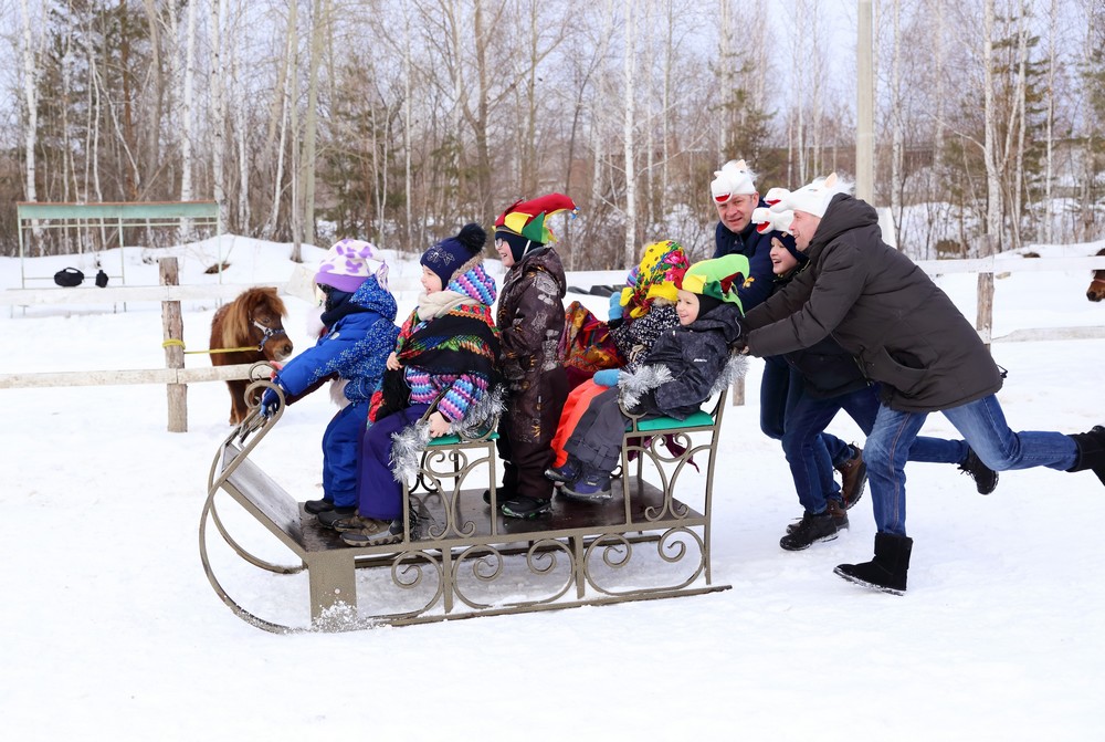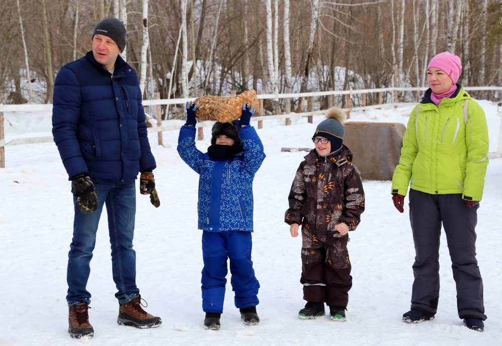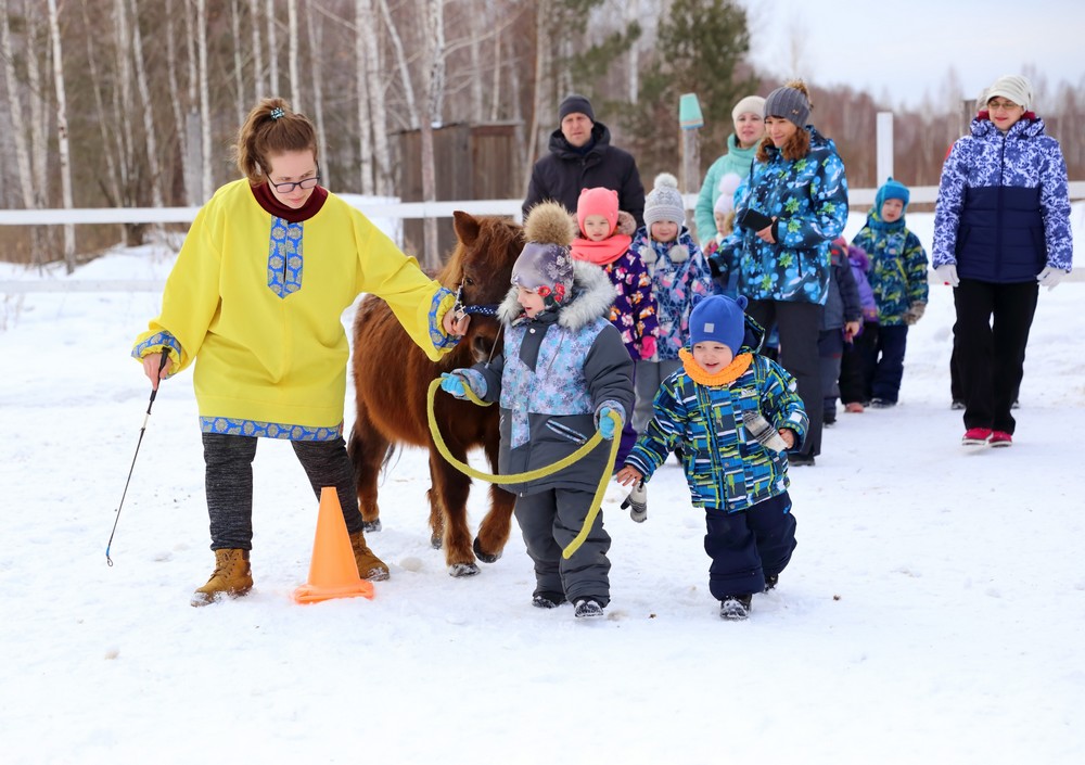 Продолжился праздник весёлыми состязаниями на площадке. Дети и родители поделились на две команды и с удовольствием участвовали в различных эстафетах. «Чей пони самый быстрый?» - дети, держа пони за уздечку, преодолевали различные препятствия (с инструктором). «Собери шарики в полёте» - родители, держа ребёнка на натянутых верёвках, бежали до фишек, с которых ребёнок забирал шар. «Быстрые сани» - пап нарядили в маски лошадок и они на скорость катали детей в санях. «Лапти» - народная игра и много других забав. В этих эстафетах дети проявили себя настоящими товарищами: они подбадривали друзей, болели за них и сочувствовали, когда команда приходила на финиш не первой. А папы и мамы как будто снова стали детьми, столько в них было азарта и задора!