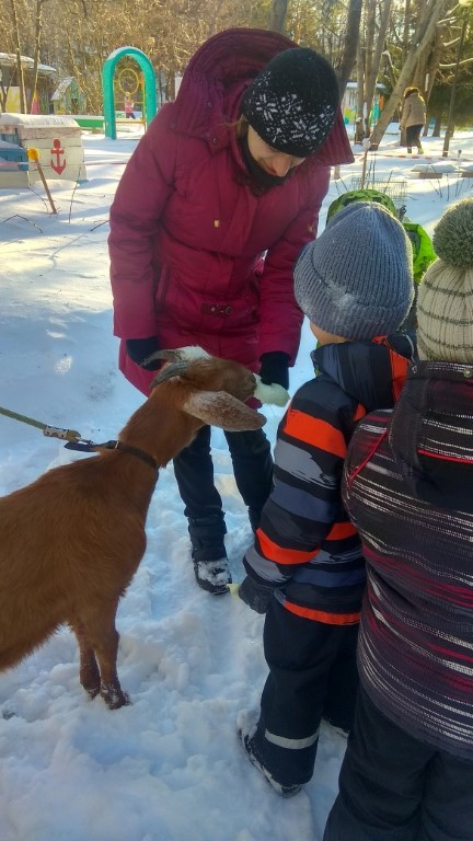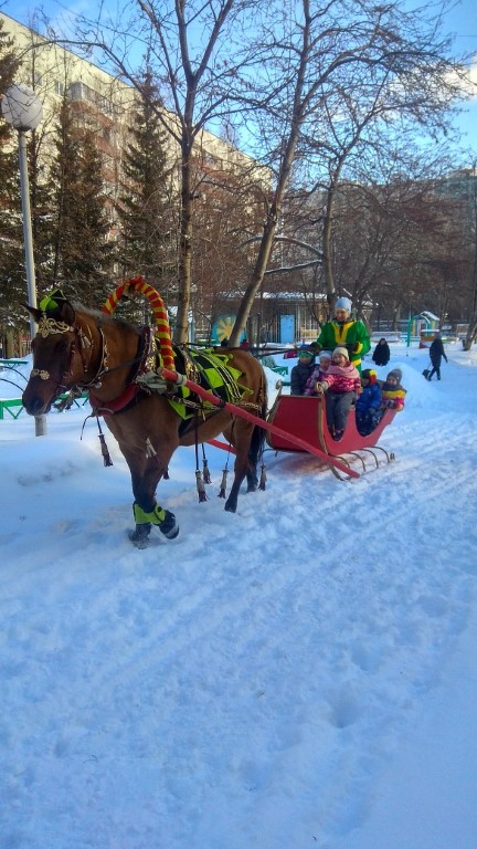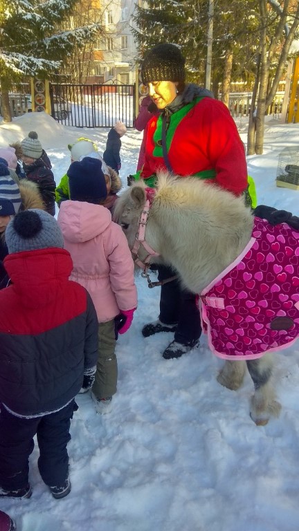 Как положено на празднике дети от души веселились, водили хороводы, с восторгом катались на лошадях, запряженных в красивые сани, которых любезно предоставил конный клуб «Невада», а также организовали посещение контактного зоопарка. Детям предоставили возможность погладить и покормить козочку, пони и курочку.