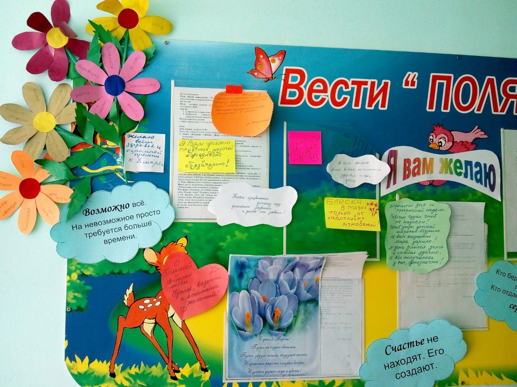 Завершилась «Неделя психологии» коллективной акцией «Я вам желаю», в которой приняли участие все участники образовательного процесса: сотрудники детского сада, родители и дети. Все пожелания были размещены на стенде «Вести «Полянки».