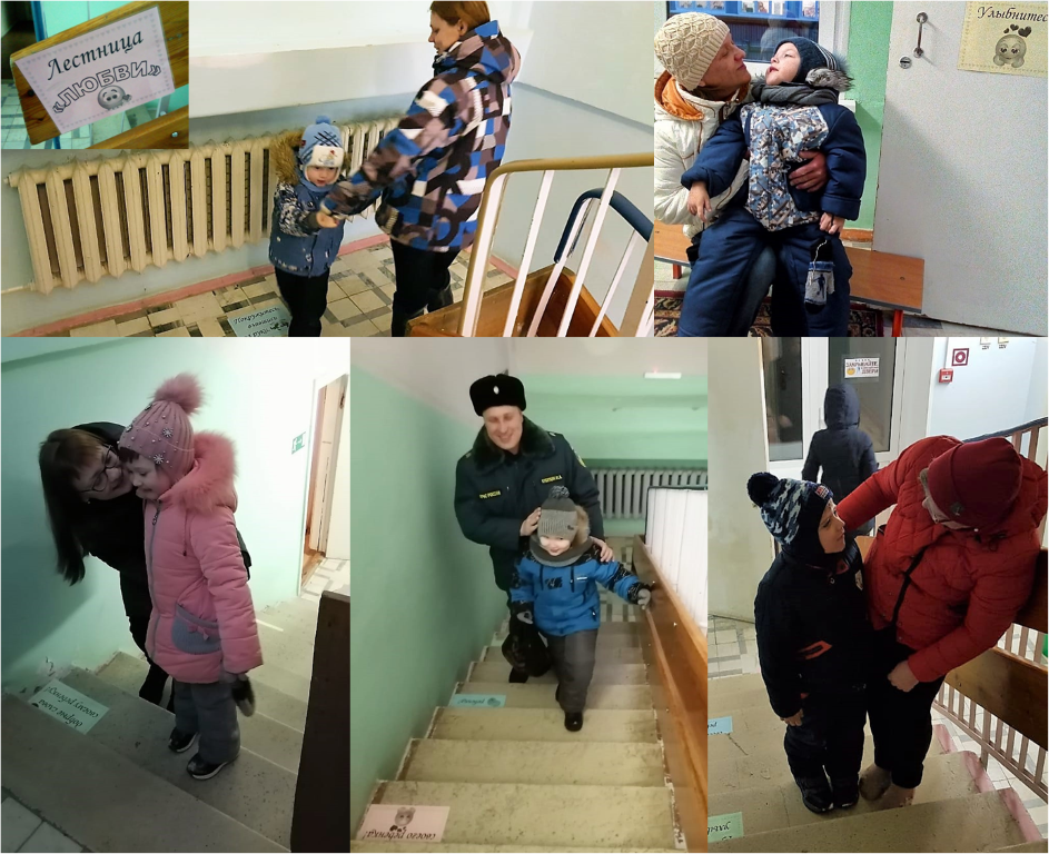 Утром в детском саду родители и дети с удивлением обнаружили, что подниматься в группы будут не просто по лестнице, а по «Лестнице Любви», которая предлагала выполнить несложные и приятные задания: «Обнимите своего ребенка!», «Подмигните друг другу», «Скажите своему ребенку добрые слова!», «Поцелуйте своего ребенка!», «Похвалите своего ребенка!», «Погладьте по голове своего ребенка», «Покружитесь, взявшись за руки», «Улыбнитесь!»