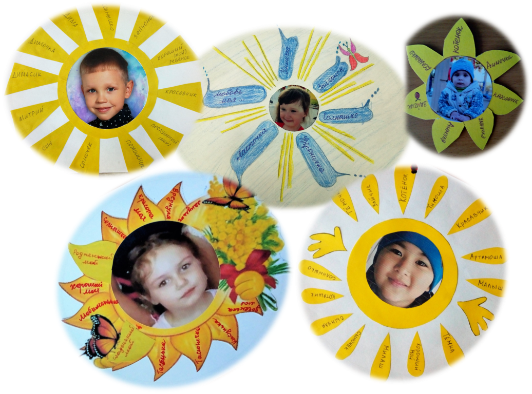 Выразить любовь родителей к своим детям помог проект «Мой портрет в лучах солнца». Через рисунок, аппликацию, поделку взрослые вместе с детьми красочно оформляли солнышко: в середине фото ребенка, а на лучиках писали семейные прозвища или производные имени ребенка. А бабочку, божью коровку или цветочек прикрепляли на тот лучик, где написана та форма имени, которая больше всего нравится малышу.