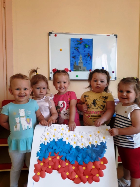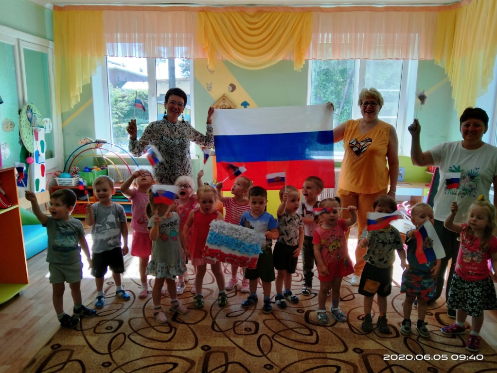 В дошкольном учреждении прошел музыкально-патриотический праздник, на котором дети выполняли упражнения с российскими флажками, играли в дидактическую игру «Собери флаг», украсили цветами и шариками из разноцветных салфеток российский флаг.