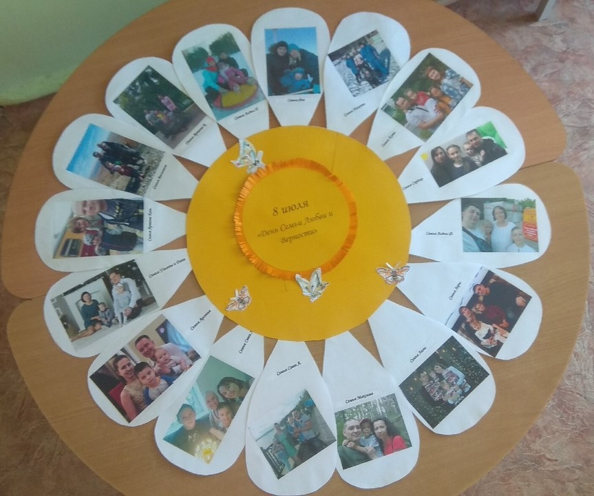 Также не остались в стороне и младшие дети. Группа № 7 (3-4 года) сделала большую ромашку, разместив в ее лепестках семьи своих воспитанников.