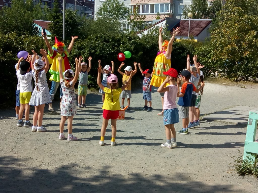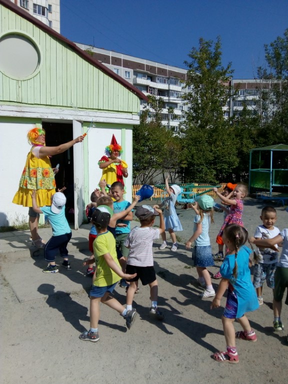 Для ребят была подготовлена замечательная музыкально – игровая программа: забавные клоуны на групповых участках развлекали детвору – веселые игры, шутки и танцы, разноцветные мыльные пузыри, хоровод под песню «Каравай…». И, конечно же, хоровое исполнение песни «Пусть бегут неуклюже…». В такой знойный день сюрпризным моментом стали любимые всеми детками игры с водой.