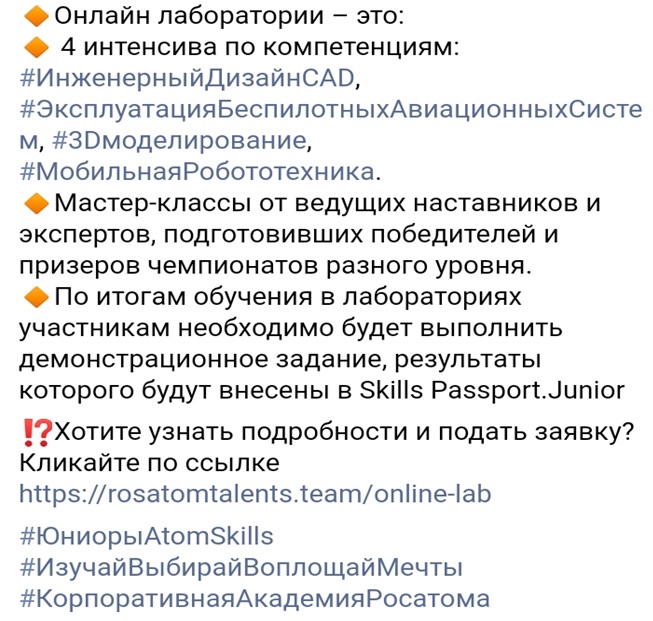 Корпоративная Академия Росатома приглашает школьников в возрасте 12-18 лет в онлайн лаборатории по 4-ем компетенциям Движения инженерно-технического творчества «Юниоры AtomSkills», которые пройдут со 2 по 6 ноября.