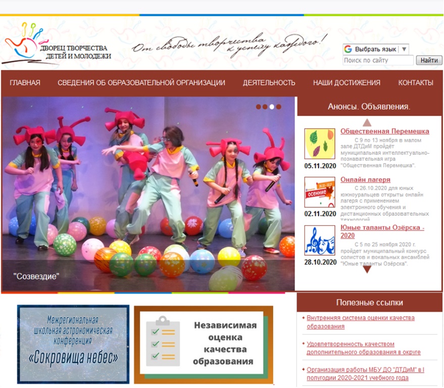 «Выбор Дворца творчества выпал на «Сайт образовательной организации» и не напрасно: среди победителей в этой номинации мы заняли первое место! Эксперты конкурса отметили современные концепции оформления ресурсов, грамотное описание событий, хорошую подготовку материала и широкий спектр освещения информации. Всего на нашем сайте http://ozerskdtdm.ru/ отмечено 84 559 посещений, при средней активности в среднем 100-120 в день. Надеемся, что вы присоединитесь к числу подписчиков (1164) ДТДМ на страничке VK.