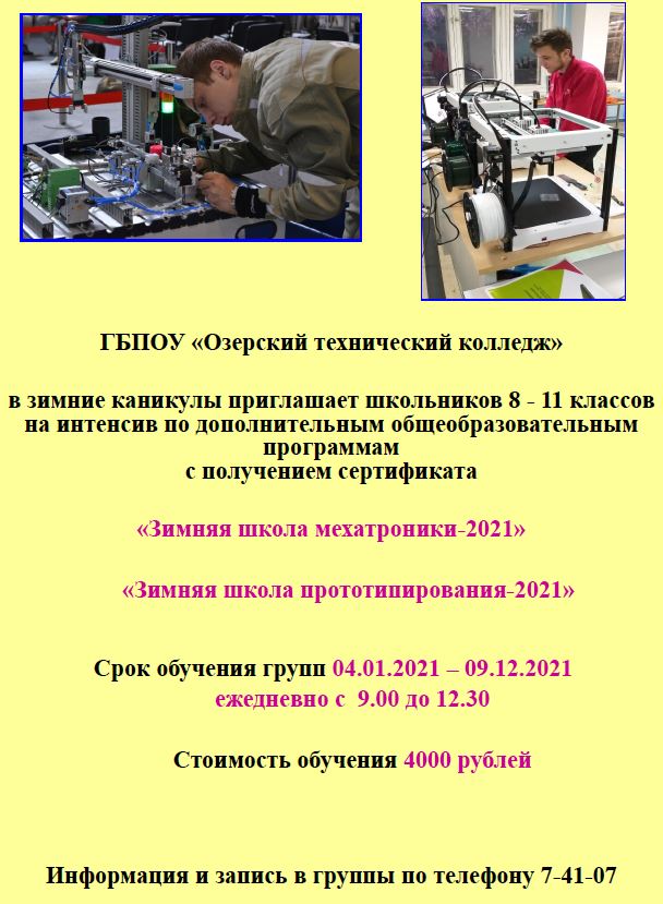 ГБПОУ «Озерский технический колледж» в зимние каникулы приглашает школьников 8 - 11 классов на интенсив по дополнительным общеобразовательным программам с получением сертификата: