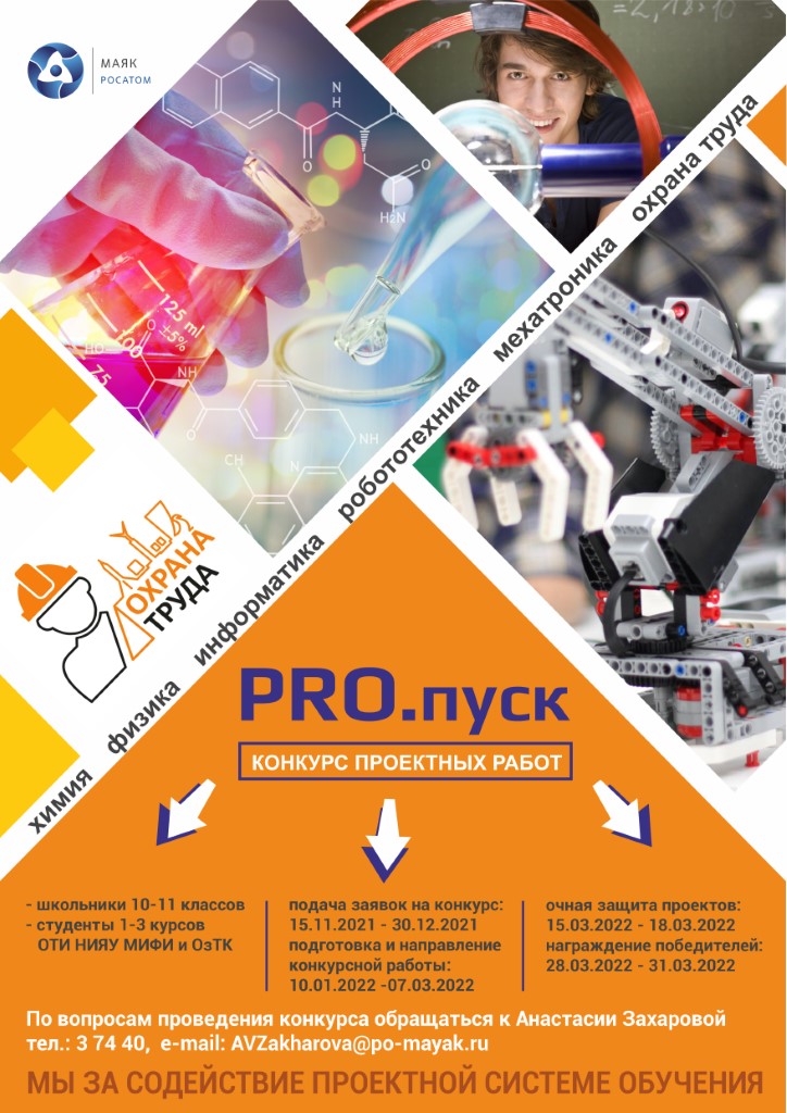 Организатором конкурса является ФГУП ПО «Маяк». Конкурс проводится по следующим направлениям проектной деятельности: информатика, физика, химия, робототехника, мехатроника, охрана труда.