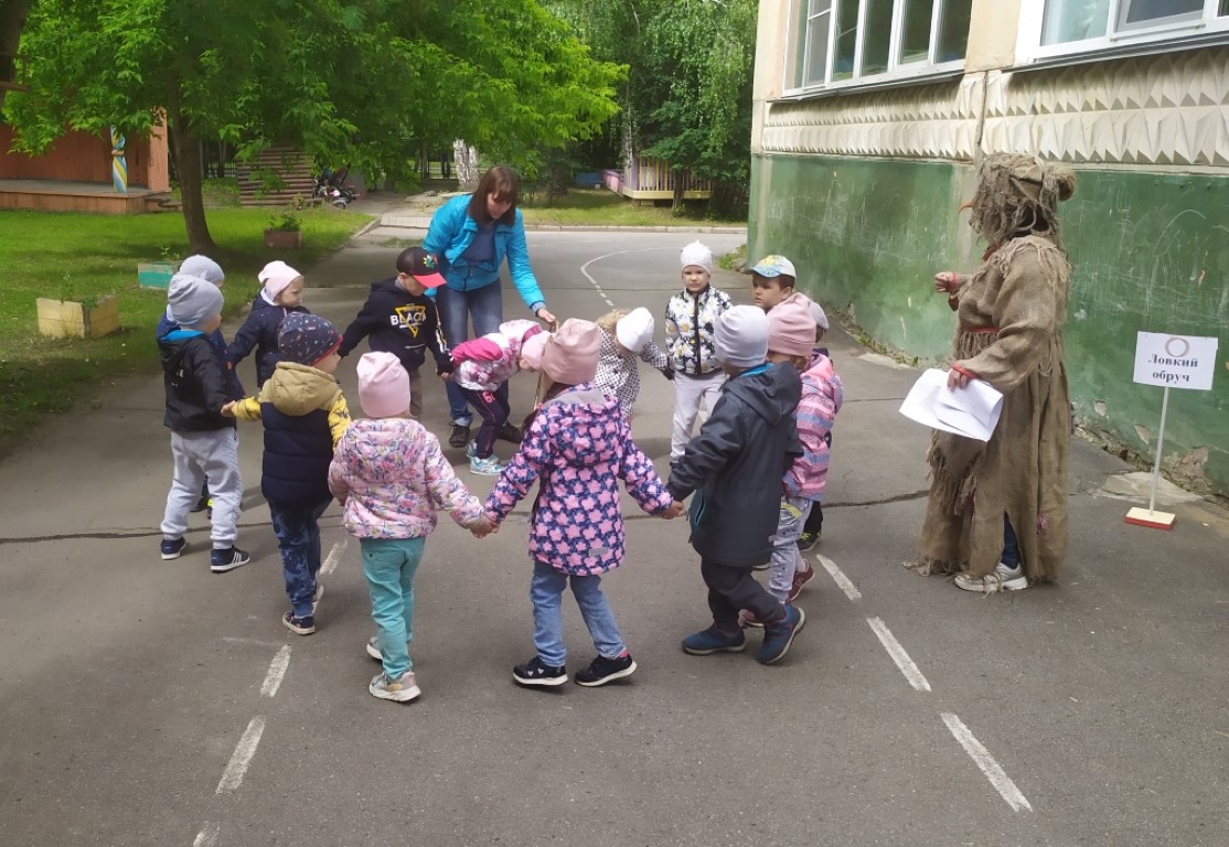 С Волшебницей ребята сделали весёлую зарядку «Солнышко лучистое», Гудвину подсказали, какие сказки «потеряли» разные предметы (Золотой ключик, пропеллер, мыло, градусник, серебряную туфельку), а с бабой Ягой поиграли в её любимую игру с зонтиками «Мухоморы». Получив путеводные карты, дети отправились вместе со сказочными героями спасать волшебную страну – искать кусочки Книги Сказок.