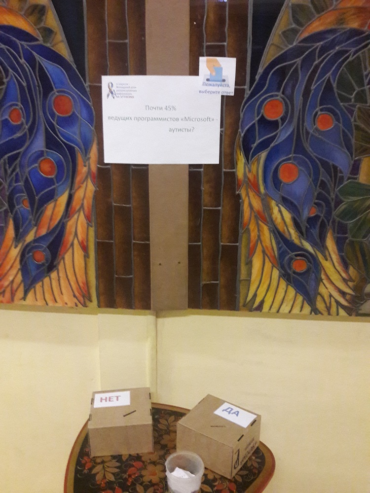 31 марта – состоялось анкетирование родителей и сотрудников ДОУ. Участникам предлагалось ответить на вопросы, связанные с мифами и реальностью о проблеме аутизма. Свой выбор взрослые делали с помощью цветных жетонов («да»-«нет»).