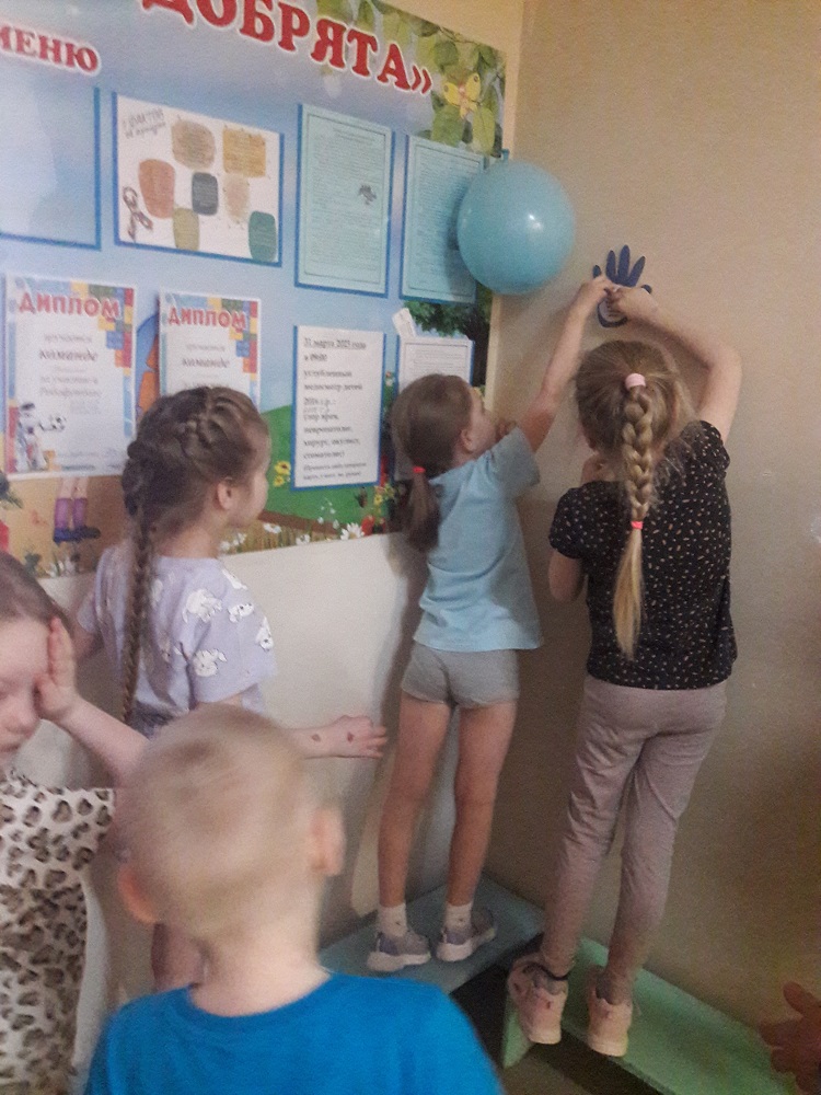 31 марта – был организован просмотр детьми 5-7 лет мультфильма «Аутизм может делать удивительные вещи» (профессор Tony Attwood). Затем в каждой группе воспитатели побеседовали с детьми о смысле увиденного. Дошкольники поразили своим пониманием и чуткостью. Ответы были серьезными и поучительными. Например, на вопрос «Чем мы можем помочь детям с аутизмом?» дети отвечали: «Мы можем с ними дружить, но, если ты не хочешь или боишься, просто не трогай таких людей». После беседы дети и воспитатели старших и подготовительных групп повесили синие воздушные шары возле входа в группу, в знак поддержки детей с РАС.